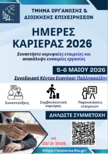 Το Τμήμα Οργάνωσης και Διοίκησης Επιχειρήσεων, με τη συμμετοχή και των Τμημάτων Μηχανολόγων Μηχανικών και Μηχανικών Πληροφορικής, Υπολογιστών και Τηλεπικοινωνιώνθα διοργανώσει εκδήλωση “Ημέρες Καριέρας” στις 5 και 6 Μαίου 2026.